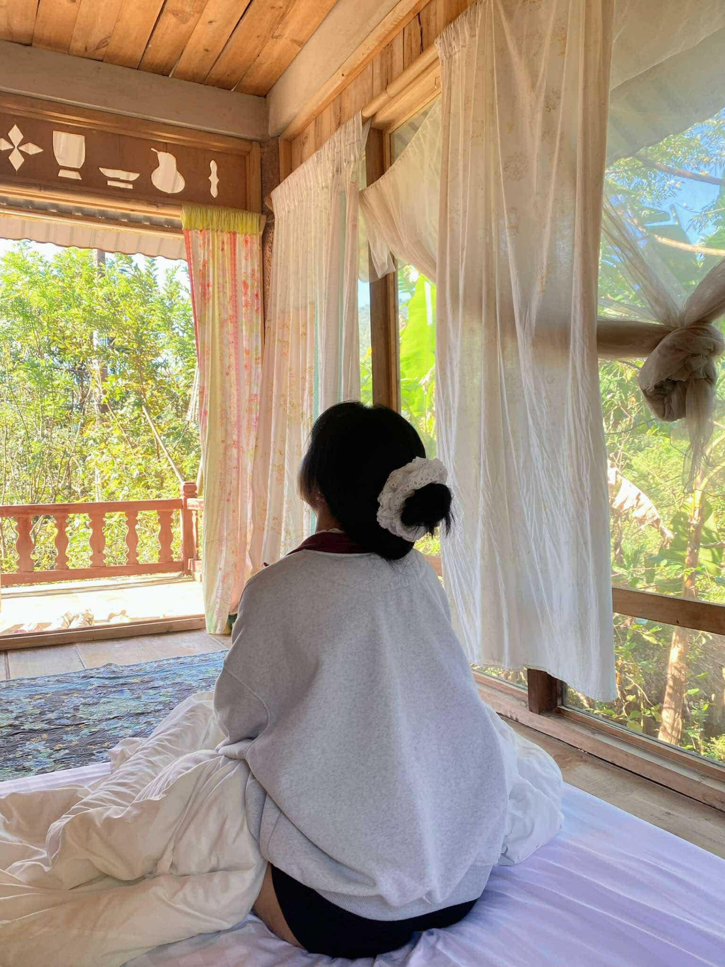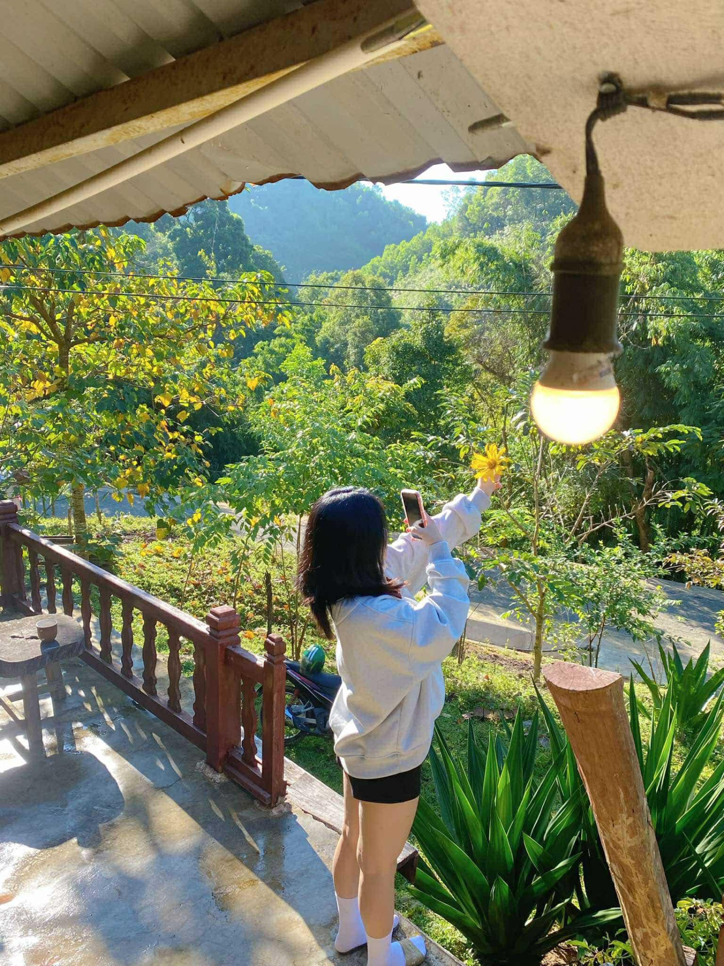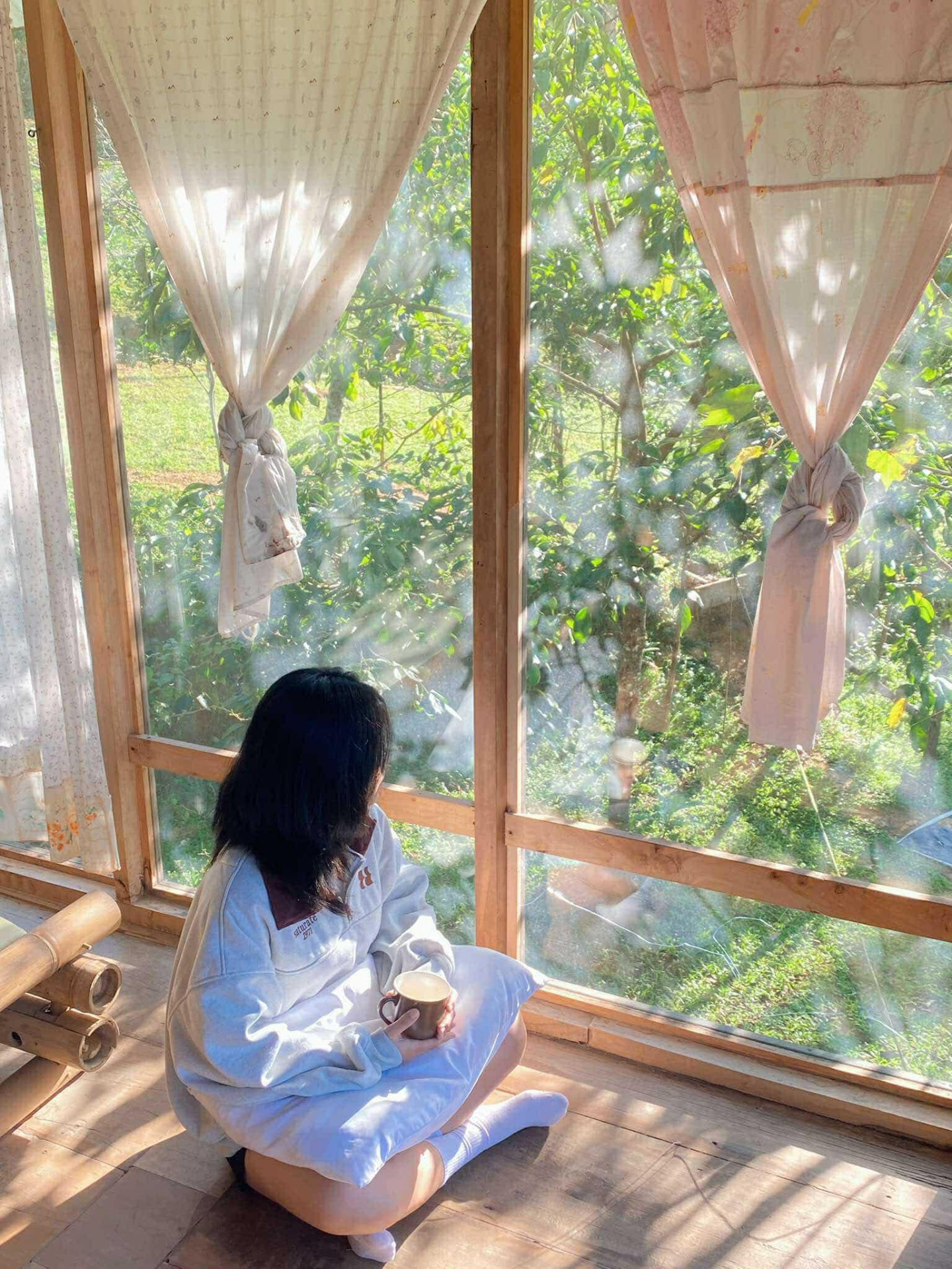 Nhà sàn gỗ trên đồi gồm: 3 phòng ngủ, bếp, phòng shc, hiên trà. View xung quanh là đồi núi, suối Anor, cây xanh mướt.